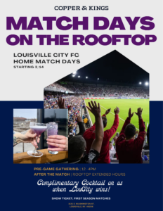 Celebrate every LouCity win with us. For select early-season matches, show your ticket after a victory for a complimentary Copper & Kings cocktail on the house!